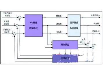 鍋爐的燃燒過程是一個極其復雜的化學過程與物理傳熱過程,鍋爐的燃料量、送風量、引風量的控制具有強耦合、非線性、多變性、大滯后等特點,所以整個燃燒系統的控制必須協調控制才能保證鍋爐負荷、壓力、氧量、溫度、負壓的穩定。針對鍋爐燃燒系統的這種特殊性,APC優化控制系統的研發集成了多變量自適應控制器、智能仿人工控制策略、預測控制、模糊控制、自動尋優、反饋校正等核心技術,真正實現了鍋爐在正常工況與異常工況下的全自動運行。優化控制系統輸入輸出原理圖如圖1所示。