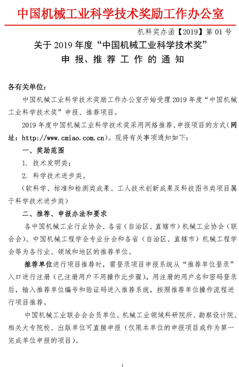 關(guān)于2019年度“中國(guó)機(jī)械工業(yè)科學(xué)技術(shù)獎(jiǎng)”申報(bào)、推