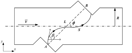 一種提高氣體超聲流量計(jì)測(cè)量精度的方法,包括下列步驟:1)給定管道直徑,順流發(fā)射點(diǎn)A坐標(biāo),初始發(fā)射角度;逆流發(fā)射點(diǎn)B坐標(biāo),初始發(fā)射角度;迭代時(shí)間步長(zhǎng)和最大迭代步數(shù);2)確定迭代結(jié)束邊界:順流時(shí),射線傳播到發(fā)射點(diǎn)B接收表面時(shí)停止追蹤;同理逆流時(shí),射線傳播到發(fā)射點(diǎn)A接收表面時(shí)停止追蹤;3)基于射線聲學(xué)理論,利用計(jì)算機(jī)編程分別對(duì)順流、逆流情況進(jìn)行射線追蹤,得到順流、逆流射線上的各個(gè)追蹤點(diǎn)坐標(biāo);4)分別計(jì)算超聲波實(shí)際傳播軌跡長(zhǎng)度,即實(shí)際聲程,和各追蹤點(diǎn)切線方向與流動(dòng)方向的夾角,即實(shí)際聲路角,得到順流實(shí)際聲程Sd和聲路角βd,逆流實(shí)際聲程Su和聲路角βu;根據(jù)求解迭代步數(shù)和時(shí)間步長(zhǎng),得到超聲波順、逆流實(shí)際傳播時(shí)間td和tu;5)代入時(shí)差法氣體超聲流量計(jì)算修正公式: