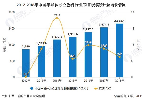 據(jù)半導體行業(yè)協(xié)會統(tǒng)計數(shù)據(jù)顯示, 2012年至2018年國內(nèi)半導體分立器件市場需求保持了11.41%的年均復合增長;2018年國內(nèi)半導體分立器件市場需求達到2699.8億元,同比2017年的2458.1億元增長率達到9.8%,繼續(xù)保持著高速增長趨勢。其中,半導體功率器件仍是帶動中國半導體分立器件市場加速增長的主要動力。