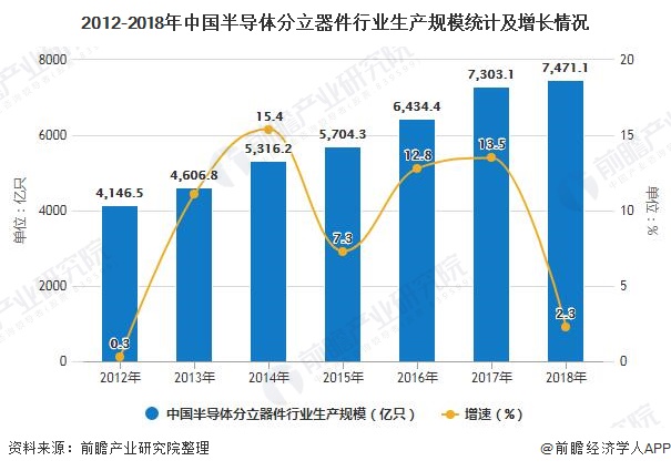下游市場需求直接拉動了半導體分立器件的生產(chǎn)規(guī)模。改革開放以來,特別是進入21世紀后,我國半導體分應器件行業(yè)內(nèi)企業(yè)不斷增加,分立器件的產(chǎn)量隨之攀升;2012年,我國半導體分立器件的整體生產(chǎn)規(guī)模為4606.8億只,至2018年增長至7471.1億只,年均復合增長率達到8.82%。