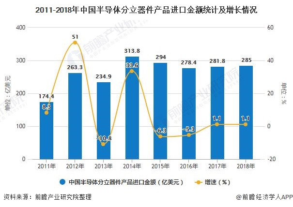 半導體行業(yè)發(fā)源于歐美,日韓及中國臺灣在產(chǎn)業(yè)轉移中亦建立了先進的半導體工業(yè)體系。中國半導體起步晚、追趕難度較大。近年來,我國高度重視半導體行業(yè)的發(fā)展,不斷出臺多項鼓勵政策大力扶持包括分立器件在內(nèi)的半導體行業(yè),半導體分立器件行業(yè)已獲得長足發(fā)展,并逐步形成對國外產(chǎn)品的替代。據(jù)中國半導體行業(yè)協(xié)會統(tǒng)計,2011年至2014年中國半導體分立器件產(chǎn)品進口額基本保持增長趨勢,2014年進口額達313.8億美元。2017年中國半導體分立器件進口金額為281.8億美元,相較于2014年進口額下降了10.20%,2018年中國半導體分立器件進口金額為285.0億美元,與2017年基本持平。