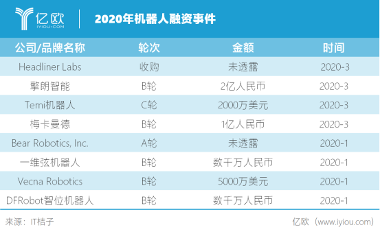 到了2020年,從一月到三月,機(jī)器人行業(yè)的融資事件共有8起。3月,擎朗機(jī)器人獲得2億人民幣,梅卡曼德獲得1億人民幣。
