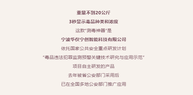 近日,全國禁毒工作電視電話會議提出“強化禁毒科技攻關,有效提升毒品檢驗鑒定能力”,這個“利好”意味著該產(chǎn)品市場前景廣闊,這讓華儀寧創(chuàng)總經(jīng)理兼總工程師聞路紅很興奮。