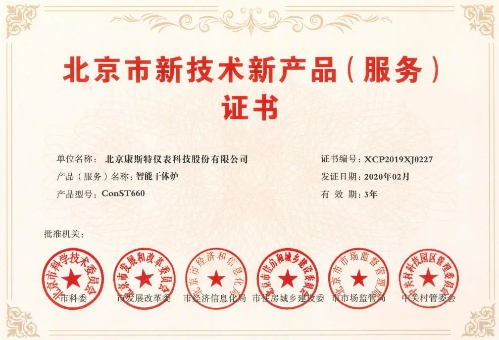 近日,康斯特產(chǎn)品——ConST660智能干體爐由北京市科學技術(shù)委員會等六家單位聯(lián)合評審后,獲得“北京市新技術(shù)新產(chǎn)品(服務)證書”,這也是康斯特第四次被授予此項榮譽,體現(xiàn)了康斯特技術(shù)和產(chǎn)品服務創(chuàng)新的實力。