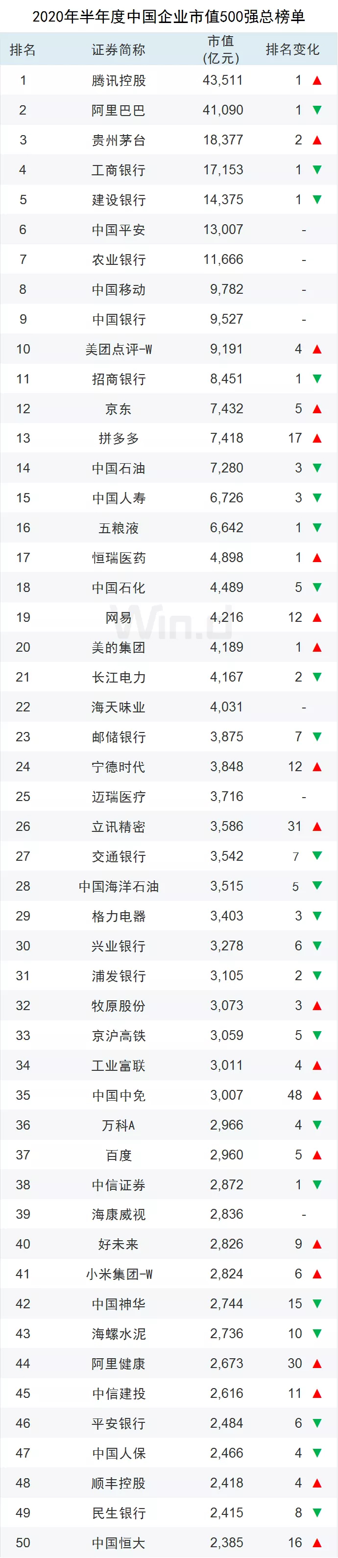 近日,Wind最新發(fā)布2020年半年度“中國上市企業(yè)市值500強”榜單。