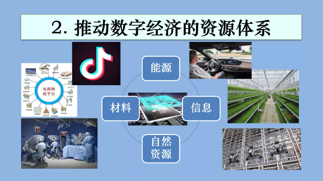 到2035年,整個國家的經濟發展水平到達中等發達國家水平,現代經濟現代產業體系基本構建,所以數字經濟發展的支撐資源體系應該是能源、信息、材料、自然資源四大塊,是四大塊支撐著經濟和社會的運行。