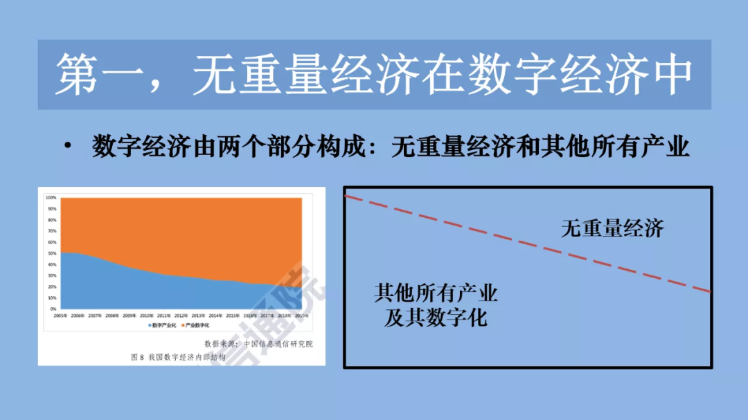 主要差異點體現在三個方面:第一,真正的數字經濟由無重量經濟和其他所有產業兩部分構成。社會只要人存在,需求仍然存在,只考慮無重量經濟部分絕對不行的。