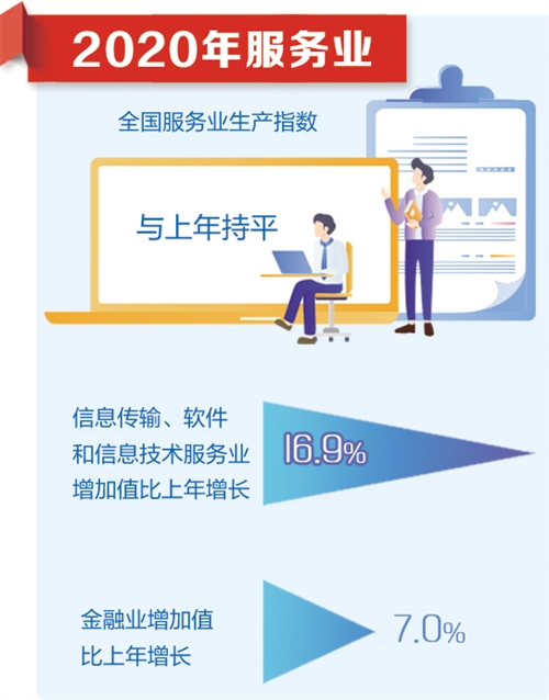 2020年,除批發(fā)和零售業(yè)、住宿和餐飲業(yè)、租賃和商務(wù)服務(wù)業(yè)外,其他行業(yè)均實現(xiàn)正增長。其中,信息傳輸、軟件和信息技術(shù)服務(wù)業(yè)增加值增速為16.9%,實現(xiàn)兩位數(shù)增長;金融業(yè)增加值增速為7.0%,比2019年提高0.4個百分點。這兩個行業(yè)對經(jīng)濟增長的貢獻(xiàn)率合計達(dá)到54.1%,有力支撐了經(jīng)濟較快恢復(fù)。