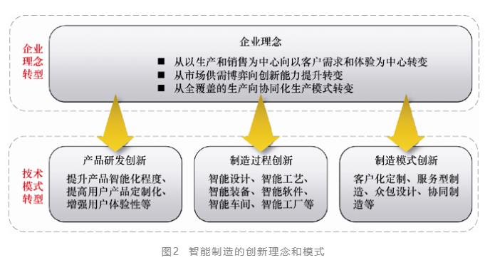 智能制造是企業在技術創新、經營管理、制造運行以及生態建立等多方面采取系統性的,甚至是創新性的技術與管理改進工程。這需要一個符合企業發展特點的整體規劃,以避免出現“1+1<2”式的資源浪費和盲目跟風投資。智能制造的轉型升級與沿革多年的以改善企業內部效益為驅動的方式不同,它是面向個性化的市場需求和新階段社會發展理念的創新性變革,因此企業應樹立整體、系統的革新意識,而不是沿用傳統的技改思路。智能制造的創新理念和模式如圖2所示。