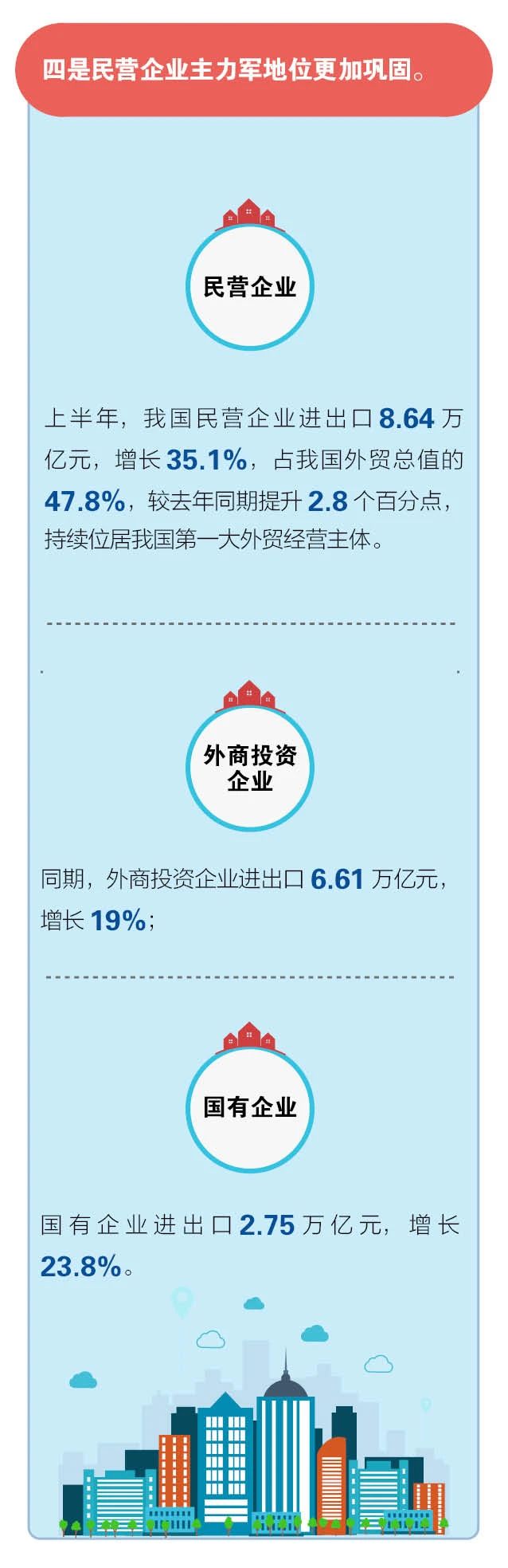 二是有進出口實績的民營企業(yè)增多。上半年,有進出口實績的民營企業(yè)39.7萬家,同比增加了3.7萬家,占有進出口實績企業(yè)總數(shù)的82.8%。