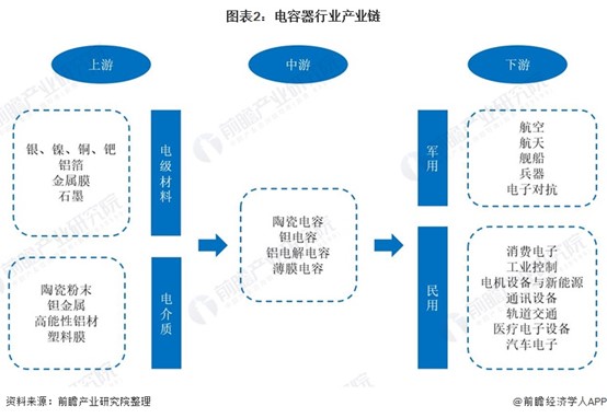 電容器產(chǎn)業(yè)鏈上游為電極材料和電解質(zhì)材料行業(yè),下游行業(yè)主要應(yīng)用于軍用和民用領(lǐng)域,軍用領(lǐng)域包括航空、航天、艦船、兵器、電子對(duì)抗等,民用領(lǐng)域包括消費(fèi)電子、工業(yè)控制、電力設(shè)備及新能源、通訊設(shè)備、軌道交通、醫(yī)療電子設(shè)備及汽車電子等。