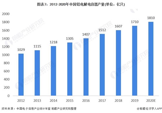 全球鋁電解電容器的主要生產(chǎn)地集中在日本、臺(tái)灣地區(qū)、韓國(guó)和中國(guó)大陸。但近幾年,全球鋁電解電容器產(chǎn)業(yè)逐漸向中國(guó)轉(zhuǎn)移,對(duì)我國(guó)的鋁電解電容器產(chǎn)業(yè)發(fā)展起到了一定的推動(dòng)作用。2010年以來(lái),我國(guó)鋁電解電容器的產(chǎn)量逐漸增大,呈現(xiàn)不斷擴(kuò)大的趨勢(shì)。2019年我國(guó)鋁電解電容器的產(chǎn)量約為1710億只,同比增長(zhǎng)6.4%。根據(jù)當(dāng)前發(fā)展趨勢(shì),測(cè)算2020年我國(guó)鋁電解電容器產(chǎn)量將達(dá)到1810億只。