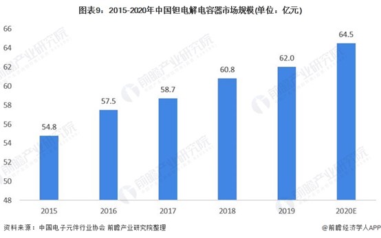 根據(jù)中國(guó)電子元件行業(yè)協(xié)會(huì),2019年鉭電解電容器市場(chǎng)規(guī)模為62億元,較上年增長(zhǎng)1.99%,前瞻估計(jì)2020年中國(guó)鉭電解電容器市場(chǎng)規(guī)模約為64.5億元。