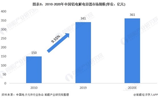 根據(jù)中國(guó)電子元件行業(yè)協(xié)會(huì),2010年我國(guó)鋁電解電容器市場(chǎng)規(guī)模市場(chǎng)規(guī)模約為150億元,到2019年鋁電解電容器市場(chǎng)規(guī)模已經(jīng)達(dá)到341億元,較2018增長(zhǎng)5.24%,前瞻估計(jì)2020年中國(guó)鋁電解電容器市場(chǎng)規(guī)模約為361億元。