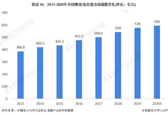 陶瓷電容器為電容器中使用最廣、用量最大的類別,2019年中國(guó)陶瓷電容器市場(chǎng)規(guī)模為578億元,較2018年增長(zhǎng)6.2%,增速在四大品類中位居首位。前瞻測(cè)算,2020年陶瓷電容器的市場(chǎng)規(guī)模約為596億元。