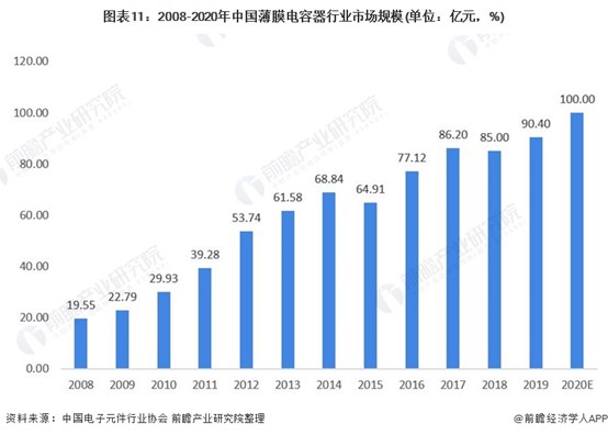 2019年我國(guó)薄膜電容器市場(chǎng)規(guī)模為90.40億元,約占全球市場(chǎng)總產(chǎn)值的60%以上,位居全球第一。2010年至2019年,我國(guó)薄膜電容器行業(yè)市場(chǎng)規(guī)模年復(fù)合增長(zhǎng)率為13%,遠(yuǎn)高于全球薄膜電容器市場(chǎng)8%的復(fù)合增長(zhǎng)率。隨著國(guó)內(nèi)新能源汽車產(chǎn)業(yè)的應(yīng)用發(fā)展,節(jié)能減排嚴(yán)要求的趨勢(shì),薄膜電容器產(chǎn)業(yè)經(jīng)過(guò)幾年的蓬勃發(fā)展趨于穩(wěn)定,預(yù)計(jì)2020年國(guó)內(nèi)薄膜電容器市場(chǎng)規(guī)模將達(dá)到100億元左右。