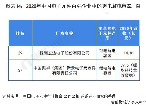 2020年中國(guó)電子元件百?gòu)?qiáng)企業(yè)中,2家鉭電解電容器廠商入選,其中,株洲宏達(dá)電子股份有限公司排名最前(29名)。宏達(dá)電子產(chǎn)品涉及鉭電容器、多層瓷介電容器、單層瓷介電容器、薄膜電容器、高分子片式鋁電容器、超級(jí)電容器等。中國(guó)振華(集團(tuán))新云電子元器件有限責(zé)任公司為振華科技子公司,目前擁有全密封固體鉭電容器、液體鉭電容器、片式鉭電容器、有引線模壓固體但電容器、樹(shù)脂包封固體但電容器、鋁電容器六大類產(chǎn)品生產(chǎn)線、可生產(chǎn)鉭、鋁電容器科類達(dá)90多個(gè)系列品種、10000多個(gè)規(guī)格。