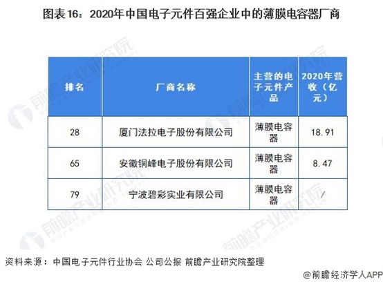 2020年中國(guó)電子元件百?gòu)?qiáng)企業(yè)中,3家薄膜電容器廠商入選,其中,廈門(mén)法拉電子股份有限公司排名最前(28名)。