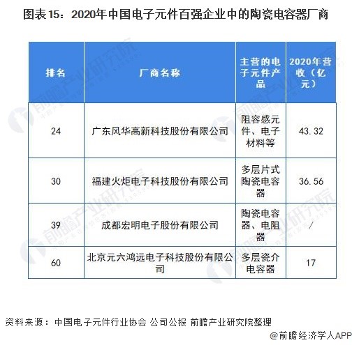 2020年中國(guó)電子元件百?gòu)?qiáng)企業(yè)中,4家陶瓷電容器廠商入選,其中,廣東風(fēng)華高新科技股份有限公司排名最前(24名)。