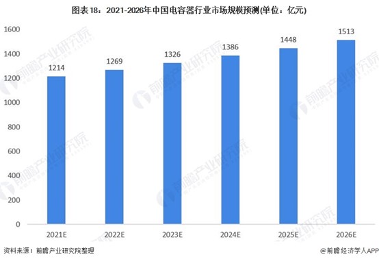 隨著下游5G通訊行業(yè)、新能源汽車行業(yè)、消費(fèi)電子業(yè)的技術(shù)升級(jí),電容器的應(yīng)用領(lǐng)域?qū)⒉粩嗤貙?,需求量越?lái)越大。因此,電容器具有廣闊的發(fā)展空間。前瞻保守估計(jì),2021-2026年電容器行業(yè)市場(chǎng)規(guī)模將以4.5%左右的增速增長(zhǎng),2021年電容器行業(yè)市場(chǎng)規(guī)模預(yù)測(cè)為1214億元,2026年電容器行業(yè)市場(chǎng)規(guī)模預(yù)測(cè)為1513億元。