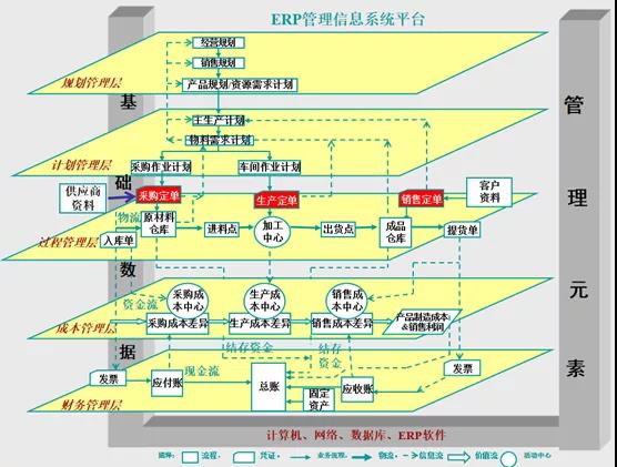在圖1中.(計算機、網絡、數據庫、ERP軟件)基礎設施、基礎數據、管理元素、專業管理(職位)層、計劃流程、業務流程都會通過ERP管理信息系統平臺(多維度的)互聯互動。一個有限的、有序的、合規的、直觀的、可行的企業信息化模型。