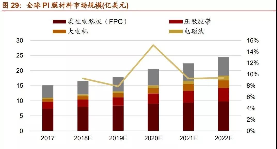 PI 薄膜是市場規(guī)模最大的聚酰亞胺細分領域。2010 年以來,智能手機、電子顯示、柔 性電路板等領域快速發(fā)展,驅(qū)動 PI 薄膜產(chǎn)業(yè)快速發(fā)展。在 5G 與消費電子創(chuàng)新周期的 驅(qū)動下,天線材料、電子元器件、柔性顯示等領域有望維持強勁的發(fā)展勢頭。另外,主 要國家在航空航天領域加大投入,將會拉動高性能特種 PI 膜的需求。