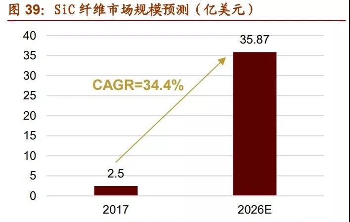 據(jù)不完全統(tǒng)計,2015 年全球連續(xù)碳化硅纖維的總產(chǎn)量達 300 噸。未來幾年,隨著美日 主要生產(chǎn)商進一步擴產(chǎn),中國、中東生產(chǎn)商入局,預計世界碳化硅纖維總產(chǎn)量至 2025 年有望增長至 500 噸左右。根據(jù) Stratistics MRC 預測,SiC 纖維市場 2017 年的估值為 2.5 億美元左右。隨著 SiC 纖維的研究工作不斷深入、使用場景逐步增加,其市場需求 有望快速擴大。預計到 2026 年 SiC 纖維的市場規(guī)模將增長至 35.87 億美元,復合年增 長率將達到 34.4%。