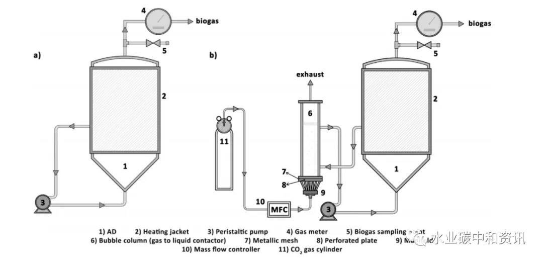 眾所周知,CO2是在消化過(guò)程中伴隨著甲烷產(chǎn)生的產(chǎn)物。而另一方面,利用厭氧消化進(jìn)行CO2捕集固定是一種潛力十足的碳減排策略。兩個(gè)處理食品垃圾的厭氧消化試驗(yàn)進(jìn)行了225 d監(jiān)測(cè),實(shí)驗(yàn)組定期使用氣泡柱充入CO2(Fernandez et al.)。實(shí)驗(yàn)組測(cè)試CH4產(chǎn)率為0.56±0.13 m3 CH4/kgVS·d(對(duì)照組為0.45±0.05 )沼氣中CH4濃度為68%,額外攝取了外源CO2 0.55 kg,H2濃度增加了2.5 倍,這歸因于CO2溶解以及酸化與產(chǎn)氫途徑改變。