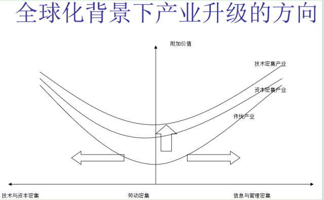 這條三條線代表不同的產業,最低的是傳統產業,往上是資本密集產業、技術密集產業。在同等價格環節上,它們都會有一個升級的過程。縱向是傳統產業升級,叫產業間的升級。因為有了全球價值鏈,一個國家的升級有了兩個新的方向,在微笑曲線向兩端升級,就是從低附加價值環節向上游研發和復雜零部件生產升級,以及向下游去做服務、做品牌在新的全球化背景下,一個國家的升級有了三個方向,既有傳統的產業間升級,同時又有了價值鏈的升級。這是我們討論全球價值鏈帶來的一個很重要的新思路。