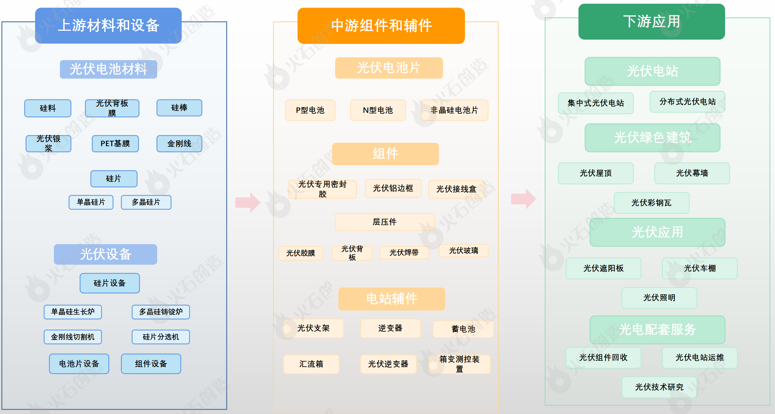 從光伏產業鏈看,上游包括硅料、硅片、PET基膜等光伏電池材料,以及硅片設備、電池片設備、組件設備等;中游包括光伏電池片、光伏組件、電站輔件等;下游包括光伏電站建設運營、光伏綠色建筑、光伏應用、光電配套服務等。