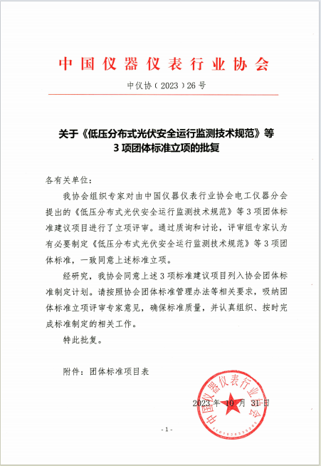 我協(xié)會(huì)組織專(zhuān)家對(duì)由中國(guó)儀器儀表行業(yè)協(xié)會(huì)電工儀器分會(huì)提出的《低壓分布式光伏安全運(yùn)行監(jiān)測(cè)技術(shù)規(guī)范》等3項(xiàng)團(tuán)體標(biāo)準(zhǔn)建議項(xiàng)目進(jìn)行了立項(xiàng)評(píng)審。通過(guò)質(zhì)詢和討論,評(píng)審組專(zhuān)家認(rèn)為有必要制定上述標(biāo)準(zhǔn),一致同意該9項(xiàng)團(tuán)體標(biāo)準(zhǔn)立項(xiàng)。