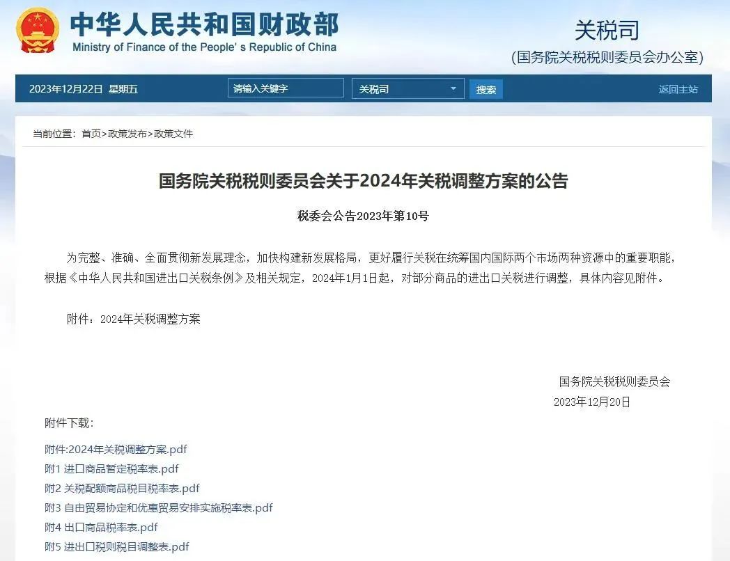 12月21日,國(guó)務(wù)院關(guān)稅稅則委員會(huì)發(fā)布2024年關(guān)稅調(diào)整方案公告。為完整、準(zhǔn)確、全面貫徹新發(fā)展理念,加快構(gòu)建新發(fā)展格局,更好履行關(guān)稅在統(tǒng)籌國(guó)內(nèi)國(guó)際兩個(gè)市場(chǎng)兩種資源中的重要職能,根據(jù)《中華人民共和國(guó)進(jìn)出口關(guān)稅條例》及相關(guān)規(guī)定,2024年1月1日起,對(duì)部分商品的進(jìn)出口關(guān)稅進(jìn)行調(diào)整。