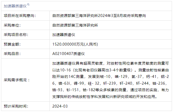 自然資源部第三海洋研究所2024年3至8月政府采購意向-加速器質譜儀詳細情況