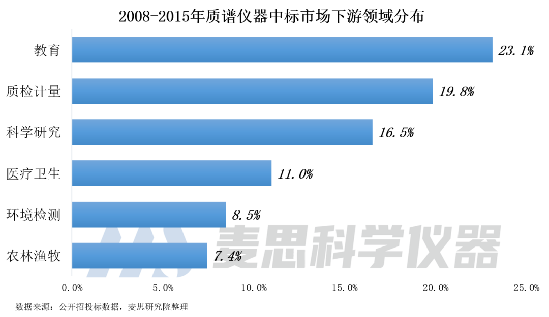 2008-2015年質(zhì)譜儀器中標(biāo)數(shù)量Top 3領(lǐng)域依次為教育、質(zhì)檢計(jì)量和科學(xué)研究領(lǐng)域,三者占比約為60%。在采購(gòu)量最大的前十名用戶(hù)中,包括國(guó)家質(zhì)量監(jiān)督檢驗(yàn)檢疫總局、浙江大學(xué)、江蘇省質(zhì)量技術(shù)監(jiān)督局等單位。