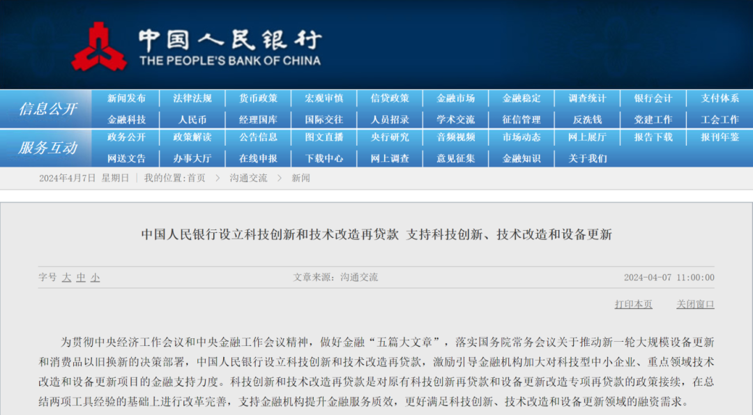 4月7日,據央行官網消息,為貫徹中央經濟工作會議和中央金融工作會議精神,做好金融“五篇大文章”,落實國務院常務會議關于推動新一輪大規模設備更新和消費品以舊換新的決策部署,中國人民銀行設立科技創新和技術改造再貸款,激勵引導金融機構加大對科技型中小企業、重點領域技術改造和設備更新項目的金融支持力度。