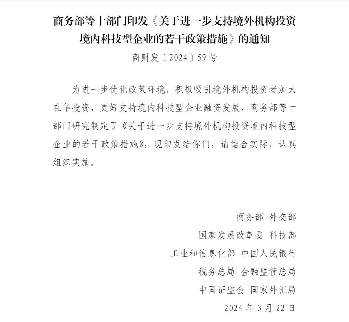 近日,商務部、外交部、國家發展改革委、科技部、工業和信息化部、中國人民銀行、稅務總局、金融監管總局、中國證監會、國家外匯局十部門聯合印發《關于進一步支持境外機構投資境內科技型企業的若干政策措施》(以下簡稱《若干措施》)。