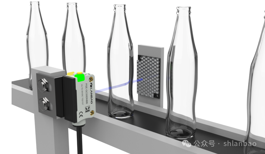通過計數來檢查和控制產品流是飲料工廠對產品包裝的一項典型應用。在飲料工業生產中,制造瓶子時將生產出多樣的產品變型,其輸送過程的循環速率較高,為實現快速流暢的運輸,需要可靠地識別瓶子,由于它們的形狀和表面情況多變、傳輸速度較高、光學特性復雜,實現穩定準確檢測尤為困難。蘭寶PSE-GC50系列光電傳感器可靠檢測透明物體,無論是薄膜、托盤、玻璃瓶、塑料瓶還是薄膜斷裂,PSE-GC50都能可靠地進行識別,不漏檢,對各種透明物體穩定檢測,大大提升流水線工作效率。