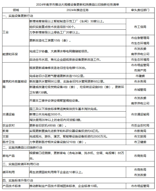 2024年南京市推動大規模設備更新和消費品以舊換新任務清單。