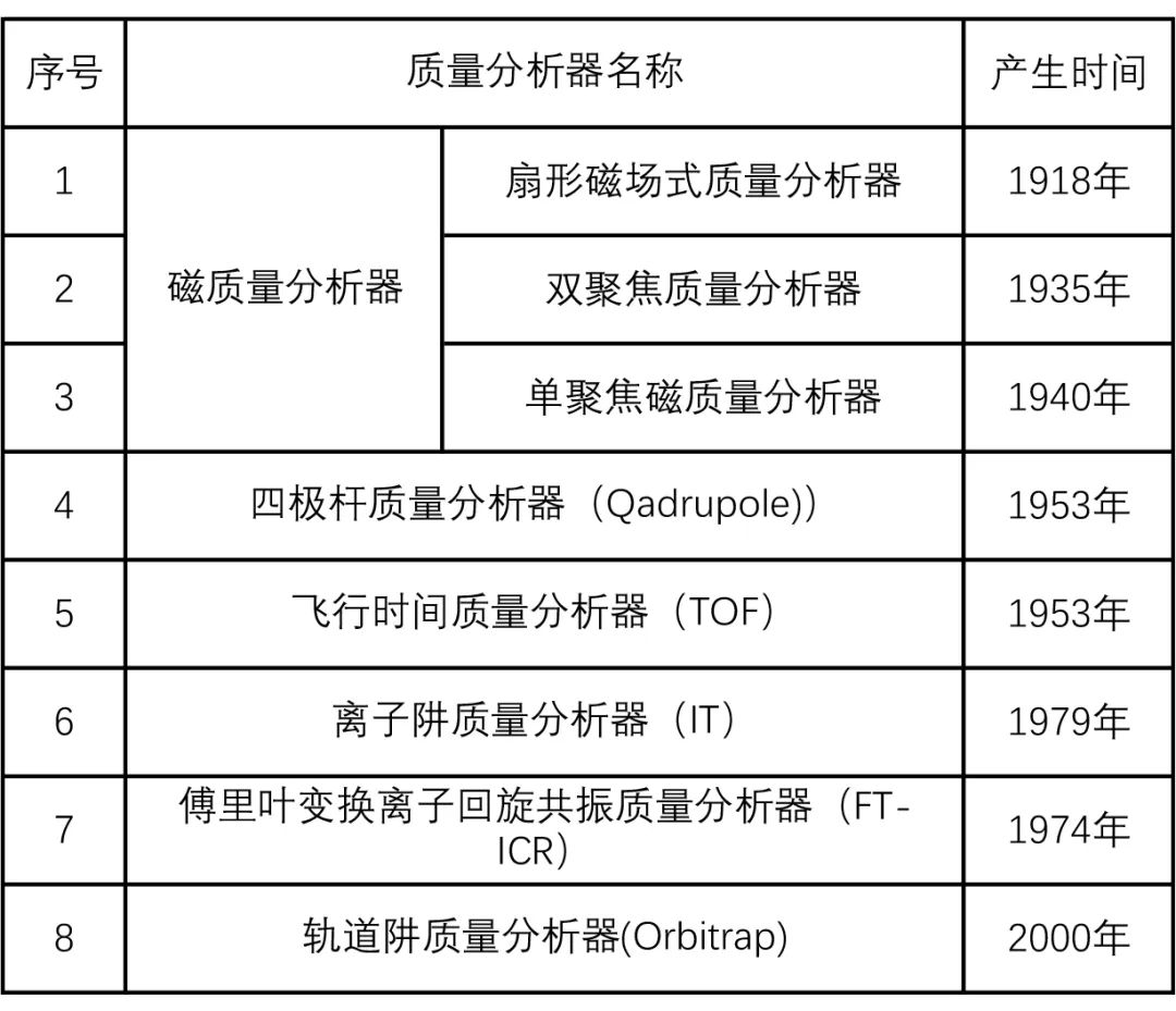 質(zhì)量分析器用于測(cè)量離子的質(zhì)量和電荷比(m/z),是質(zhì)譜儀器最為關(guān)鍵的組件。扇形磁場(chǎng)式質(zhì)量分析器于1918年問(wèn)世。1953年,四極桿質(zhì)量分析器(Quadrupole)發(fā)明,并迅速成為廣泛應(yīng)用于各類質(zhì)譜儀的核心組件之一。飛行時(shí)間質(zhì)量分析器(TOF),使離子飛行時(shí)間成為測(cè)定質(zhì)量的有效手段,在高分辨率和高精確度的質(zhì)譜分析中扮演著重要角色。1974年,傅里葉變換離子回旋共振質(zhì)量分析器(FT-ICR)發(fā)明,質(zhì)譜分析達(dá)到了歷史最高的分辨率水平。1979年,離子阱裝置出現(xiàn),它具有捕獲、存儲(chǔ)和操控離子的能力。2000年,軌道阱質(zhì)量分析器(Orbitrap)技術(shù)問(wèn)世,引領(lǐng)了質(zhì)譜儀器領(lǐng)域新的發(fā)展(表3)。