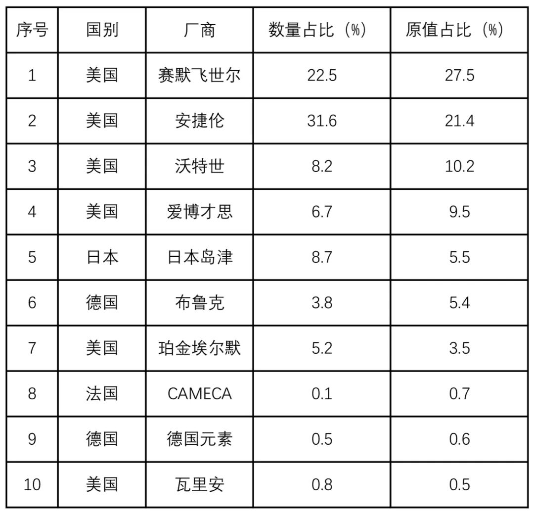 表5 購(gòu)置儀器原值總額排名前十位的廠商