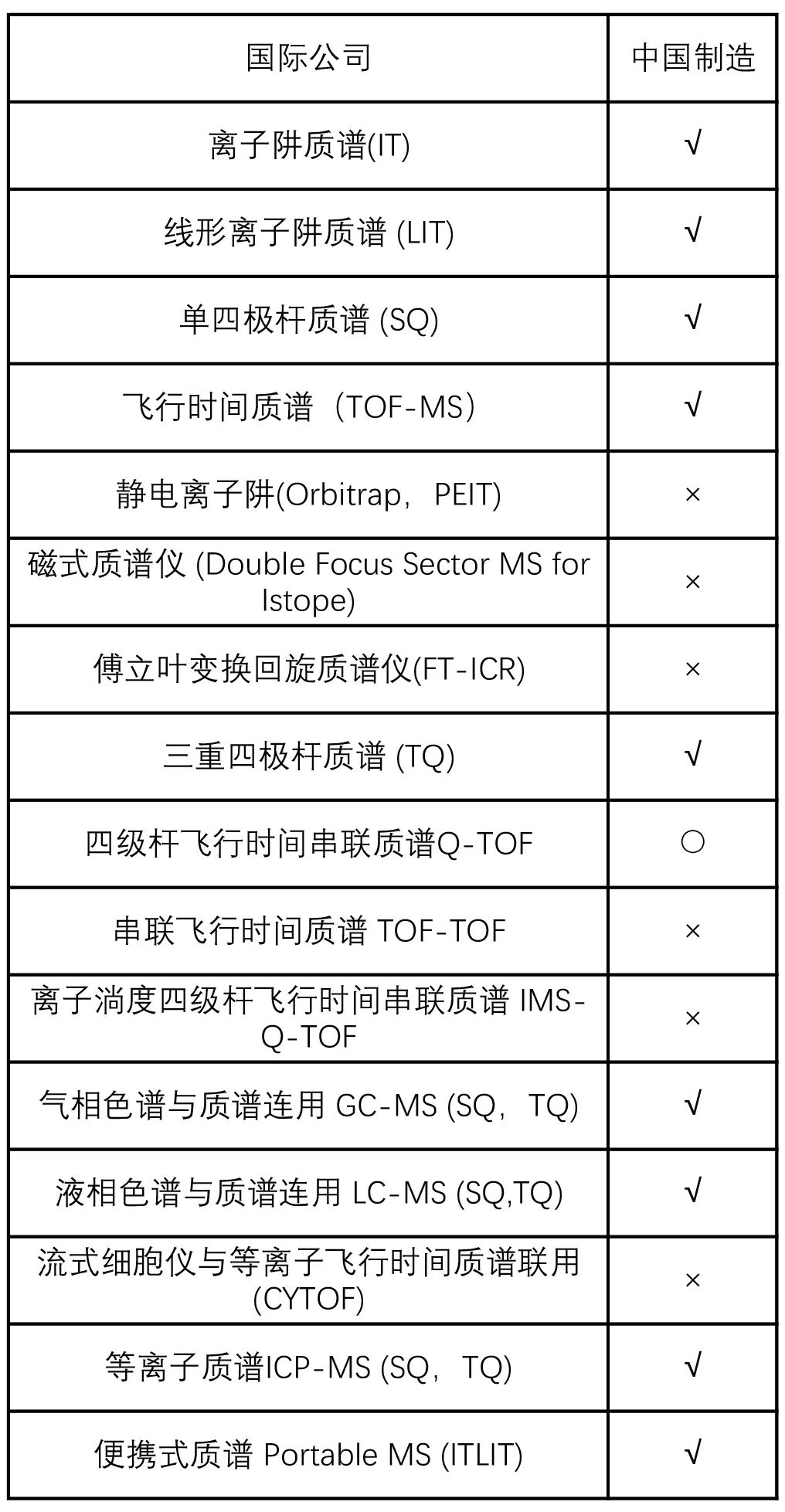 表7 國(guó)內(nèi)外質(zhì)譜儀器產(chǎn)品類型對(duì)比