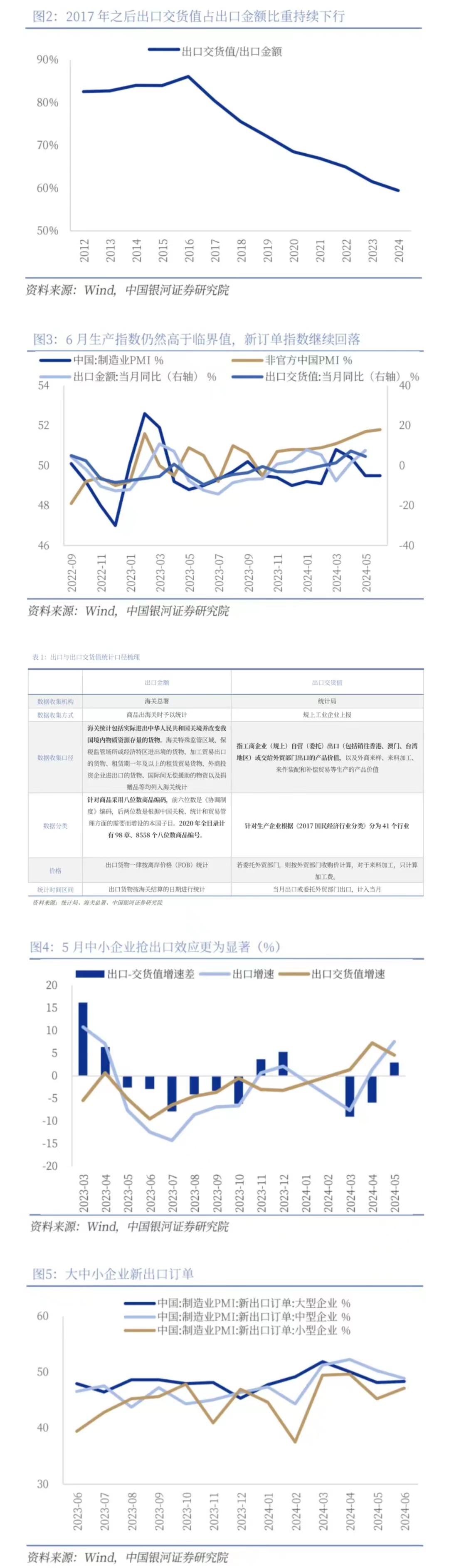 財(cái)新PMI更多反映外向型企業(yè)的景氣度,出口增速持續(xù)改善對應(yīng)財(cái)新PMI的持續(xù)擴(kuò)張。官方和財(cái)新PMI調(diào)查樣本存在差異:中采PMI的調(diào)查樣本涉及《國民經(jīng)濟(jì)行業(yè)分類》(GB/T4754-2017)中制造業(yè)的31個(gè)行業(yè)大類,3200家企業(yè),同時(shí)在選取樣本時(shí)會(huì)對增加值較高的行業(yè)賦以更高的權(quán)重,因此中采PMI抽樣的企業(yè)更多是在行中占比較高的大型企業(yè)。中采PMI更加綜合,而財(cái)新PMI更多反映外向型企業(yè)生產(chǎn)經(jīng)營情況。與之相比,財(cái)新制造業(yè)PMI統(tǒng)計(jì)樣本為650家企業(yè),普遍認(rèn)為調(diào)查樣本主要以沿海地區(qū)出口導(dǎo)向型的中小型民營企業(yè)及輕工業(yè)為主。5月出口金額同比增長7.6%,出口交貨值同比增長4.6%,保持上行趨勢。從2023年11月以來,出口金額增速除了在2024年3月受去年基數(shù)影響有負(fù)增長,其余月份均保持正增長。當(dāng)前外需整體好于內(nèi)需,出口保持較高韌性,因此財(cái)新PMI持續(xù)高于中采PMI。