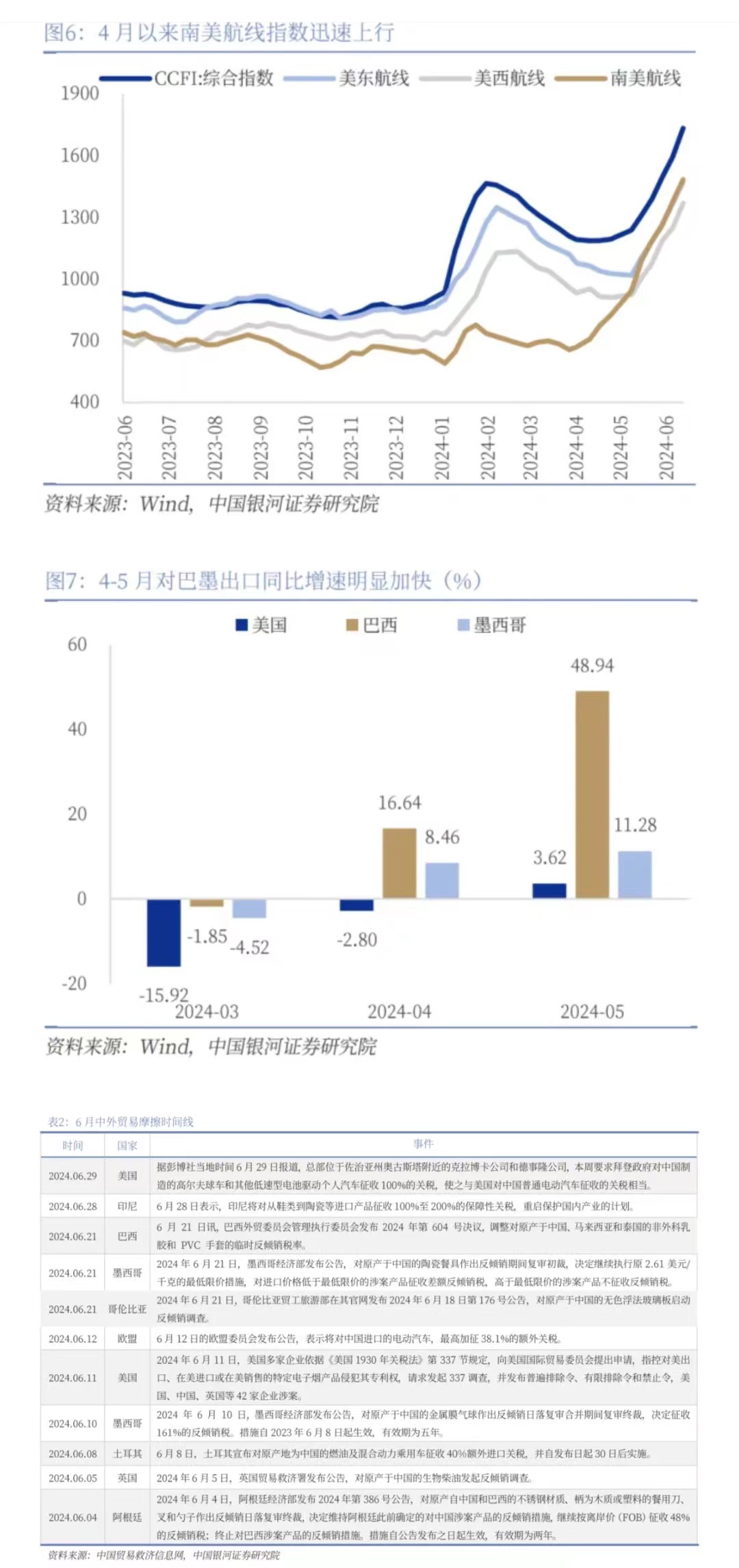 受制于進(jìn)口國貿(mào)易政策的變化和地緣政治的潛在影響,企業(yè)出現(xiàn)搶出口行為。5月14日美方發(fā)布對華加征301關(guān)稅四年期復(fù)審結(jié)果,進(jìn)一步提高對自華進(jìn)口的電動(dòng)汽車等約180億美元商品加征關(guān)稅。6月以來歐盟、土耳其、巴西、印尼等也陸續(xù)宣布將對我國部分出口商品加征關(guān)稅。受此因素驅(qū)動(dòng),企業(yè)出現(xiàn)“搶出口”行為以規(guī)避高額關(guān)稅,帶動(dòng)5月出口增速同比上行至7.6%。從航線運(yùn)價(jià)指數(shù)來看,5月份以來CCFI指數(shù)迅速上漲,美東和美西航線分別環(huán)比上漲23.5%和30.4%,南美航線上漲53.4%。從對美國、墨西哥、巴西三地的出口增速來看,5月份我國對其三者出口同比分別增長3.6%、11.3%和48.9%,對墨西哥尤其是巴西出口增速的高增長或指向部分商品借道巴墨等地以滿足對美出口需求。對外貿(mào)更加敏感的中小企業(yè)具有更顯著的搶出口效應(yīng),5月出口增速改善幅度顯著好于出口交貨值增速。