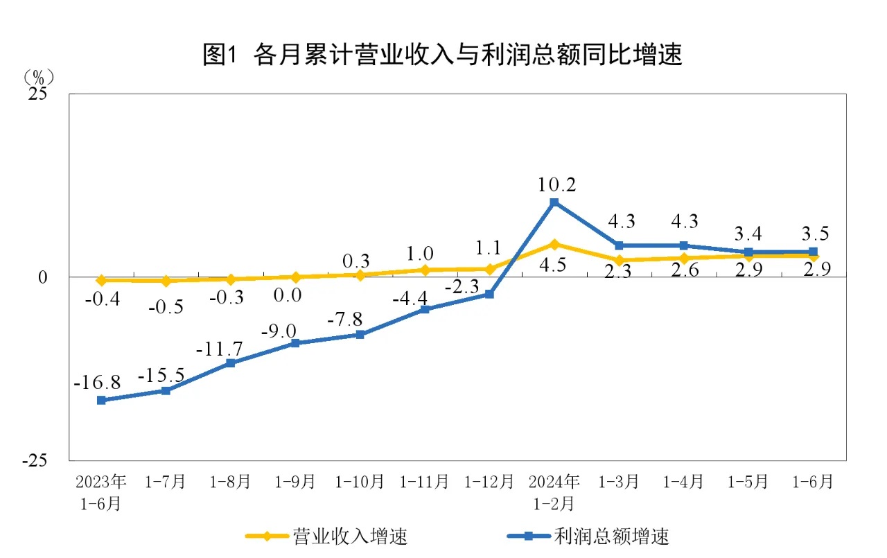 工業(yè)企業(yè)營收穩(wěn)定恢復(fù)。工業(yè)生產(chǎn)平穩(wěn)較快增長,疊加二季度以來工業(yè)品出廠價格降幅明顯收窄,共同推動企業(yè)營收穩(wěn)定恢復(fù)。上半年,規(guī)上工業(yè)企業(yè)營業(yè)收入同比增長2.9%,與1—5月份持平。企業(yè)營收穩(wěn)定恢復(fù),為利潤持續(xù)增長創(chuàng)造有利條件。