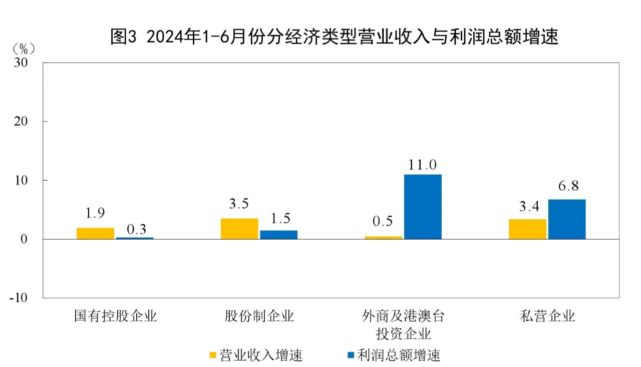 1—6月份,規(guī)模以上工業(yè)企業(yè)中,國有控股企業(yè)實現(xiàn)利潤總額12083.9億元,同比增長0.3%;股份制企業(yè)實現(xiàn)利潤總額26243.3億元,增長1.5%;外商及港澳臺投資企業(yè)實現(xiàn)利潤總額8614.9億元,增長11.0%;私營企業(yè)實現(xiàn)利潤總額9193.6億元,增長6.8%。