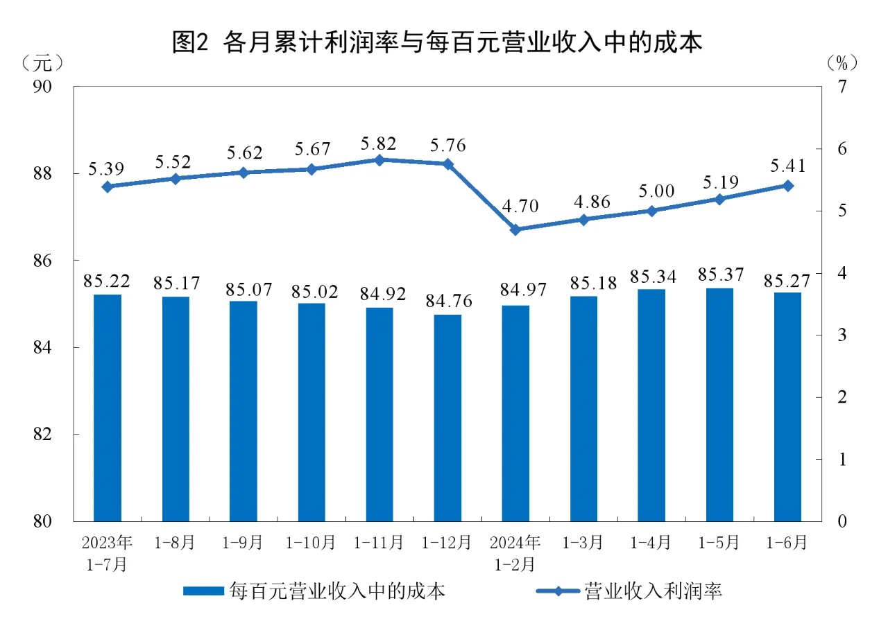 1—6月份,規(guī)模以上工業(yè)企業(yè)實現(xiàn)營業(yè)收入64.86萬億元,同比增長2.9%;發(fā)生營業(yè)成本55.31萬億元,增長2.9%;營業(yè)收入利潤率為5.41%,同比提高0.03個百分點。