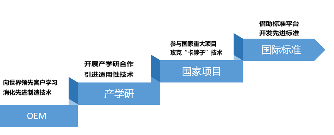堅(jiān)持高強(qiáng)度研發(fā)投入支持創(chuàng)新,近三年研發(fā)投入營(yíng)收占比均超8%,2023年超10%。公司總結(jié)出階梯式科技資源整合創(chuàng)新路徑,從早期向領(lǐng)先客戶學(xué)習(xí)基本的生產(chǎn)工藝與產(chǎn)品設(shè)計(jì)知識(shí),到與高校院所進(jìn)行產(chǎn)學(xué)研合作學(xué)習(xí)新產(chǎn)品開發(fā),再到參與國(guó)家重大工程進(jìn)行研發(fā)學(xué)習(xí)來(lái)探索前沿技術(shù)。現(xiàn)階段是借助標(biāo)準(zhǔn)平臺(tái)開發(fā)先進(jìn)標(biāo)準(zhǔn),在標(biāo)準(zhǔn)制定中學(xué)。