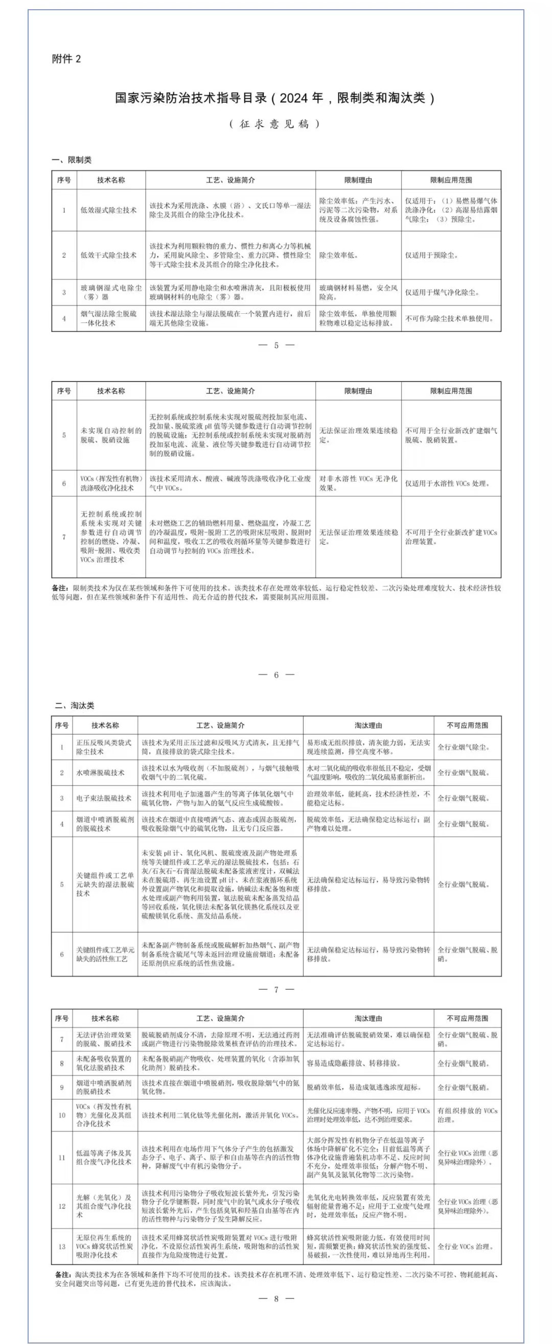 限制類技術(shù)為僅在某些領(lǐng)域和條件下可使用的技術(shù)。該類技術(shù)存在處理效率較低、運行穩(wěn)定性較差、二次污染處理難度較大、技 術(shù)經(jīng)濟性較低等問題,但在某些領(lǐng)域和條件下有適用性、尚無合適的替代技術(shù),需要限制其應用范圍。