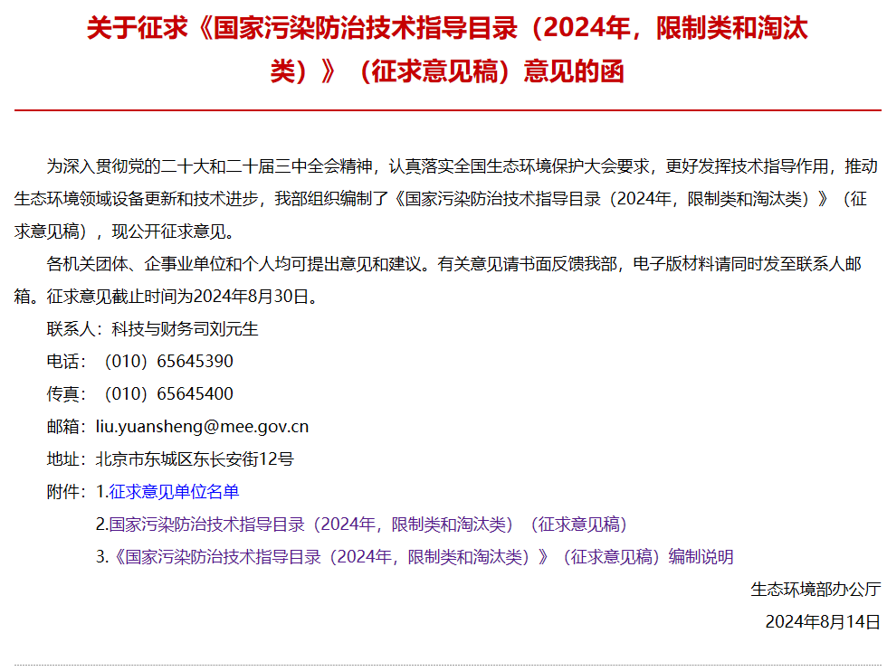為更好發(fā)揮技術(shù)指導作用,推動生態(tài)環(huán)境領(lǐng)域設(shè)備更新和技術(shù)進步,生態(tài)環(huán)境部日前發(fā)布關(guān)于征求《國家污染防治技術(shù)指導目錄(2024年,限制類和淘汰類)》(征求意見稿)意見的函,向有關(guān)單位征求意見。